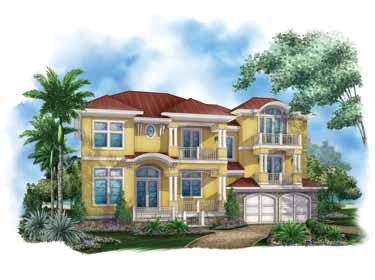 By the sea, or ocean is where you will want to build this magnificent Caribbean residence designed not only for the purpose of enjoying the beauty of its natural surroundings but also for immersing yourself in a beautiful life amidst its splendidly appointed interior which is rich with ceiling details. This floor plan has a plethora of windows along with first floor and second floor as well as two balconies, open and covered. In addition, an exclusive observation deck gives the homeowner and guests plenty of chances to enjoy waterfront views as well as sunbathe and stargaze around the pool. Inside the entry there are immediate interior views of the study with wet bar, gourmet kitchen, great room, dining room with large aquarium and the lanai and pool beyond. Second floor living is equally as resplendent with the master suite and sitting room, entertainment and exercise rooms. A third floor suite offers total privacy in this tropical home design.